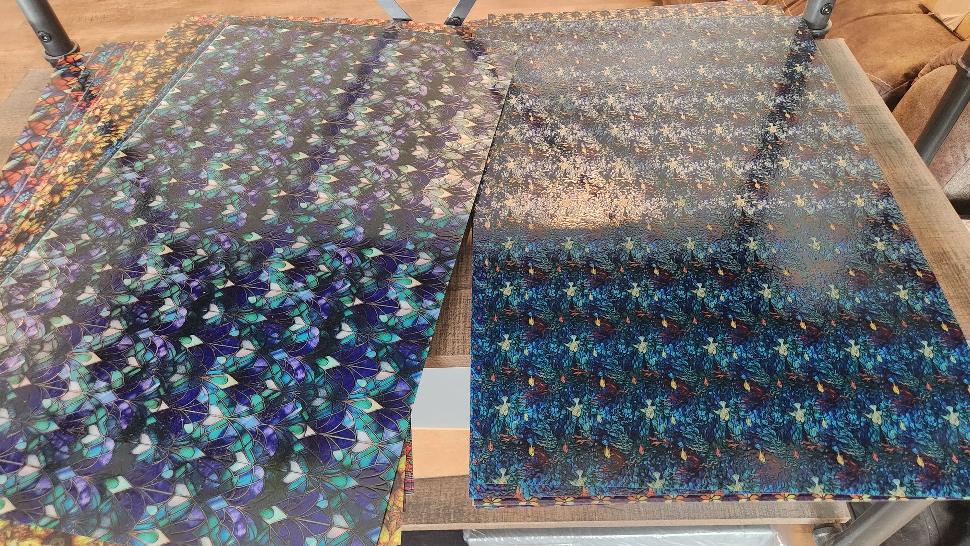 These are our test prints we took for photographs of our elevated textures realistic stained glass. There are in great condition.